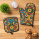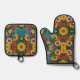 Retro 70s style colourful daisies oven mitt & pot holder set