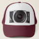 Wear a 'Head Cam' on your head with this hat that features the image of a retro black and chrome single lens reflex (SLR) camera dating from the 70s or 80s. The black and chrome camera has a filigree scroll effect etched on the surrounding chrome body. It's not a real camera; but a digitally printed image on the fabric.