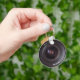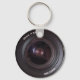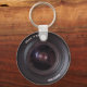 This keychain design features the lens of a retro black and chrome single lens reflex (SLR) camera dating from the 70s or 80s.