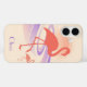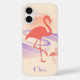 This cool retro personalized phone case features a bold flamingo silhouette with flowing wavy lines and a faded sunburst in soft pastel tones of peach, lavender, and sand.