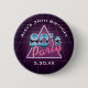80's Party button featuring a retro style typography of '80's Party''. Designs include elements of dark purple, blues, and pinks, sci-fi futuristic elements from the 80s, triangle and grid. Customize with event and date.