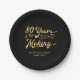 Retro 80th birthday personalized party paper plates featuring the title 80 YEARS IN THE MAKING in a calligraphy script typography which incorporates his or her birth year within the design and your custom text below (the sample shows HAPPY BIRTHDAY NAME) in gold and your choice of background colour (shown in black). ASSISTANCE: For help with design modification or personalization, transferring the design to another product or if you would like coordinating items, contact the designer BEFORE ORDERING via the Zazzle Chat MESSAGE tab below or email makeitaboutyoustore@gmail.com.