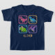 This personalized 90s arcade era t-shirt features a bold dinosaur character selection screen with four chunky, pixel dinosaur silhouettes. Each dinosaur stands in a distressed, pixelated frame, complete with glitch effects for a nostalgic, retro vibe.