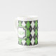 Argyle goes retro 8-bit with this green, grey, white, and black colour scheme which hearkens back to old-school arcade games. Customize the monogram with the appropriate initials for a personalized touch. This mug is available in jumbo, espresso, and bone china sizes and styles.
