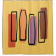 A mid century modern inspired art piece with bold colours of warped pillar-like shapes in orange, red, purple and brown with a yellow background.