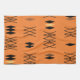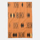 This 1950's mid century modern style pattern has black criss-crossing lines and diamonds, with shades of yellow and brown against an orange background.