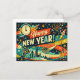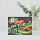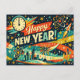 This bold and playful New Year design celebrates a retro atomic space age aesthetic with vibrant mid century style graphics. A classic clock striking midnight anchors the upper corner, while rockets, orbiting atoms, starbursts, and sweeping comet trails energize the composition. A stylized city skyline rests below colorful fireworks, creating a dynamic sense of movement and futuristic optimism. The palette of teal, mustard, coral, and cream against a deep navy background captures authentic vintage charm. Clean geometric shapes and expressive typography complete this cheerful, space inspired celebration of a bright new beginning.