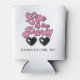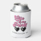 Cute can cooler for the bride's bachelorette party guests featuring "Life of the Party" in a pink retro script and heart-shaped pink sunglasses. Personalize the party location or the name of the guest in simple modern typography. A matching "Wife of the Party" can cooler for the bride is available (message us for the link).