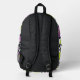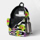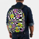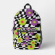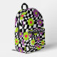 Go back to school in style with this chequered flower print backpack. Fun book bag features a cool mod style pattern of purple , lime green , and pink flowers against a crooked black and white chequered background. , with black details. Original digital artwork by Buttercup's Clothing and Collectables.