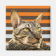 Magnet with Tabby pointed Cornish Rex cat named Benson. Background has horizontal stripes in brown, orange and grey.