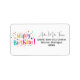 This address label features a festive "Happy Birthday!" message styled in fun, vibrant retro colours. The design is surrounded by a playful scattering of multi-coloured dots and stars that look like celebration confetti. Set on a clean white background, it includes clear sections for a name and return address in a simple, readable layout. The bright teal, pink, and orange shapes give the label an energetic and nostalgic party feel. It is a cheerful way to decorate your birthday mail and make every envelope look like a celebration before it is even opened.