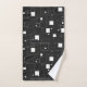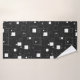 This image features a modern, abstract geometric pattern in black and white. It consists of various-sized squares and rectangles arranged randomly across a black background. Some shapes are solid white, while others are outlined, creating a layered effect. Small dots and pixel-like elements are scattered throughout, adding depth and texture. The overall design is minimalistic and conveys a digital or futuristic aesthetic.