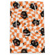 This vintage-inspired pattern features charming black cat faces with large, wide eyes and open mouths, giving them an expression of surprise or excitement. The cats are set against a vibrant, retro orange and cream chequered background with a wavy, distorted effect, evoking a sense of playful movement. Small black stars are scattered throughout the design, adding an extra element of whimsy and nostalgia. The combination of the classic Halloween colours and the bold, stylized cat faces creates a fun, slightly spooky aesthetic that harkens back to mid-century vintage design.