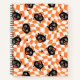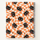 This vintage-inspired pattern features charming black cat faces with large, wide eyes and open mouths, giving them an expression of surprise or excitement. The cats are set against a vibrant, retro orange and cream chequered background with a wavy, distorted effect, evoking a sense of playful movement. Small black stars are scattered throughout the design, adding an extra element of whimsy and nostalgia. The combination of the classic Halloween colours and the bold, stylized cat faces creates a fun, slightly spooky aesthetic that harkens back to mid-century vintage design.