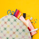 Add some retro style to any outfit with this backpack and its vintage style floral pattern. Geometric depictions of daisies in muted shades of light blue, dark green, pink, rust orange and yellow are set against a sand or beige coloured background for a simple, retro look.