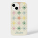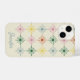 Protect your device in style with this phone case and its vintage style floral pattern. Geometric depictions of daisies in muted shades of light blue, dark green, pink, rust orange and yellow are set against a sand or beige coloured background for a simple, retro look. It's ready to personalized with a name or other text in light blue script or cursive style writing.