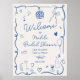 Welcome guests in style with our charming Retro french blue Bridal Shower Welcome Sign! This delightful sign features a vintage-inspired design with whimsical elements such as , food, drinks, balloons, hearts, and a pretty flowers. Framed by a playful squiggly wavy ribbon, this sign adds a touch of warmth and personality to your bridal shower decor. With customizable colours and a hand-written font, it's the perfect way to greet your guests and set the tone for a joyous celebration. Let the festivities begin with this unforgettable welcome sign