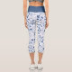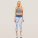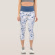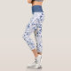 These cute capri leggings feature a delicate blue leaf swirl design on a white background. A pale blue shadow of the pattern gives added interest in the background.