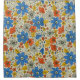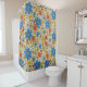 This shower curtain features a retro floral pattern that features flowers and leaves in shades of orange, blue and yellow.