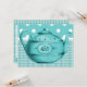 Cute retro teapot on a background of teal blue plaid and white polka dots on teal blue. You can customize it with your own text. Perfect for a bridal shower tea party.
