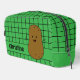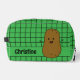 Adorable accessory bag featuring a cute happy cartoon brown potato. The background is a cute retro pattern of a black grid over a solid bold green colour. A template at the bottom and left to the potato to add your name.