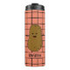 Adorable thermal tumbler featuring a cute happy cartoon brown potato. The background is a cute retro pattern of a black grid over a solid salmon pink colour. A template at the bottom and left to the potato to add your name.