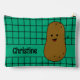 Adorable accessory bag featuring a cute happy cartoon brown potato. The background is a cute retro pattern of a black grid over a solid bold teal colour. A template at the bottom and left to the potato to add your name.