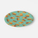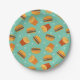 Retro style cheeseburgers and French fries pattern with small white hearts on a blue background paper plate.