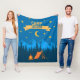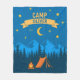 This charming kids' blanket features a cozy night of camping under a dark blue, starry sky with a bright crescent moon with an orange tent and a campfire next to a dark forest and layered blue mountains.
