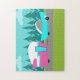 This Retro Camper / Trailer and Car Puzzle features a mid century modern, minimalist cartoon drawing that will leave you ready to take to the open road. An homage to the 1950s, this design features a vintage turquoise car with white top, pulling a kitschy travel trailer to its final destination. The perfectly restored, retro RV has a hot pink lower half, white top half, and a turquoise lightning bolt separating the two. The door in the side of the camper is also turquoise. The final accent is the hot pink wing protruding from the back of this home on wheels. The happy campers are motoring down a grey road. The roadway is surrounded by lush, green grass. In the background, we can see the teal silhouettes of a veritable forest of cedar trees, against an aqua sky with puffy, light blue clouds. This design is perfect for everyone from retired hippies, fledgling hipsters, or anyone who wants to relive some great childhood memories. The best part is that no one is asking, "Are we there yet?"