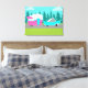 This Retro Camper / Trailer and Car Stretched Canvas Print features a mid century modern, minimalist cartoon drawing that will leave you ready to take to the open road. An homage to the 1950s, this design features a vintage turquoise car with white top, pulling a kitschy travel trailer to its final destination. The perfectly restored, retro RV has a hot pink lower half, white top half, and a turquoise lightning bolt separating the two. The door in the side of the camper is also turquoise. The final accent is the hot pink wing protruding from the back of this home on wheels. The happy campers are motoring down a grey road. The roadway is surrounded by lush, green grass. In the background, we can see the teal silhouettes of a veritable forest of cedar trees, against an aqua sky with puffy, light blue clouds. This design is perfect for everyone from retired hippies, fledgling hipsters, or anyone who wants to relive some great childhood memories. The best part is that no one is asking, "Are we there yet?"