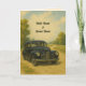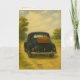 Vintage wedding invitation design featuring a classic 1940s black car on a countryside road, in a nostalgic Norman Rockwell-inspired illustration style. Perfect for retro-themed weddings.