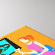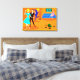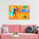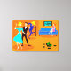 This Retro Cartoon Cocktail Party Stretched Canvas doesn't have an introverted bone in its body! The mid century modern design features a vibrant cartoon drawing of a living room and a lively cocktail party. There is an attractive couple on the dance floor. The blonde woman in a turquoise dress and her tall, dark and handsome escort are dancing the cha-cha. On the floor, there is a green record player surrounded by vinyl records. Against the far wall, a beautiful redhead is sitting on a blue sofa. She is wearing a bright pink dress. Her only accessory is the martini glass in her hand. To her side is a floor lamp minus the shade. Hmm… Where is the shade? It's on the head of a tipsy man in a blue suit who is clearly the life of the party. He's also holding a martini glass. Whoever decorated the room wasn't afraid of colour. It has an orange brick wall and an orange floor. On the wall behind the sofa, there is a teal and turquoise painting of a globe with a black frame.