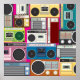 Colourful retro cassette player and radio flat design illustration on choking pink background