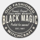 A vintage style potion label for black magic with white chalk text on a black chalkboard textured background. This is designed to be used to label a cocktail or decorations at a Halloween party or any other spooky themed event.