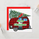 This adorable retro Christmas card has a red plaid cartoon camper hauling a xmas tree and the words Merry Christmas in green.