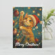 Spread holiday joy with this charming Christmas cat greeting card, featuring an adorable kitten in a Santa hat reaching for ornaments on a beautifully decorated tree. The background is adorned with twinkling lights and a festive teal sky, while the "Merry Christmas!" text adds a cheerful touch. The text on the front is editable, allowing customers to customize the message in their own language or create a personalized greeting, making this card perfect for cat lovers and holiday celebrations worldwide. On the back there is also a custom message template