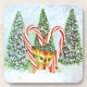 A vintage fawn figurine sits under a candy cane heart arbor in front of bottle brush trees.