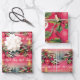 This retro vintage Christmas wrapping paper set showcases captivating scenes on a vibrant snowy hot pink background. The focal point is a large and intricately designed Christmas floral arrangement, featuring classic holiday blooms like poinsettias, holly leaves, and perhaps some mistletoe. The flowers burst forth in a rich and festive colour palette, adding warmth to the wintry backdrop. Gracefully integrated into the design is the text, elegantly written in a vintage font: "Silent Night, Holy Night" and "All is calm, All is bright".