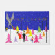 This Retro Christmas Tree Farm Door Mat features a mid century modern, minimalist, cartoon family in search of the perfect tree for trimming. The design shows Mom, Dad and Junior in a colourful, 1960s style, Christmas tree lot that looks like it belongs in a televised holiday special. They were beckoned there by the glowing, yellow spotlights illuminating the evening sky and the strands of colourful Christmas lights, which are strung from pole to pole. The snow covered lot offers trees of the cartoon variety. Don't expect to find a blue spruce here. But, if the family is wanting a pink, purple, yellow, orange or red tree, they are in luck! Hey, there are even a couple of green cedars, if they choose to go a more traditional route. The snow is continuing to fall on the merry family decked out in their holiday attire. Junior is wearing blue dungarees and a shirt that is redder than a certain reindeer's nose. Dad is wearing a black suit with a bright green tie. But it is Mom who puts the jolly is this family's wardrobe. She is wearing a red dress with green trim and a matching Santa hat. Mom and Dad are still conferring, unaware that Junior is making a mad dash to the hot pink tree of his dreams. Check every side, Junior! It wouldn't do to purchase a tree with bald spots. Wouldn't you just know it? The tree is as perfect as this design. In fact, if this design were any more perfect, you would hear a choir of children singing in the background.