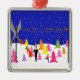 This Retro Christmas Tree Farm Holiday Ornament features a mid century modern, minimalist, cartoon family in search of the perfect tree for trimming. The design shows Mom, Dad and Junior in a colourful, 1960s style, Christmas tree lot that looks like it belongs in a televised holiday special. They were beckoned there by the glowing, yellow spotlights illuminating the evening sky and the strands of colourful Christmas lights, which are strung from pole to pole. The snow covered lot offers trees of the cartoon variety. Don't expect to find a blue spruce here. But, if the family is wanting a pink, purple, yellow, orange or red tree, they are in luck! Hey, there are even a couple of green cedars, if they choose to go a more traditional route. The snow is continuing to fall on the merry family decked out in their holiday attire. Junior is wearing blue dungarees and a shirt that is redder than a certain reindeer's nose. Dad is wearing a black suit with a bright green tie. But it is Mom who puts the jolly is this family's wardrobe. She is wearing a red dress with green trim and a matching Santa hat. Mom and Dad are still conferring, unaware that Junior is making a mad dash to the hot pink tree of his dreams. Check every side, Junior! It wouldn't do to purchase a tree with bald spots. Wouldn't you just know it? The tree is as perfect as this design. In fact, if this design were any more perfect, you would hear a choir of children singing in the background.