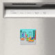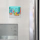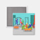 This Retro Classic Television Magnet takes you back to a simpler time. The 1960's style, minimalist, cartoon drawing will have you looking for the opening credits. The design shows a mid century modern, sunken, living room with teal and turquoise walls and a red, cone shaped fireplace, complete with a roaring fire. All eyes are on the lanky, man of the house as he makes his grand entrance. The handsome Mister is wearing a blue suit and orange tie. His lovely Mrs. and energetic, young son are rushing to greet him. The lady of the house is wearing a hot pink, sheath dress, which she fills out in all the right places. The flip in her dark hair is sheer perfection. Junior is wearing a red shirt and blue jeans for his dash to see if his father has brought him anything. Whoa! Don't knock over the potted plant, Junior! On the lower level, we can see a green couch and an orange coffee table. Wait! We appear to have guests! Seated on the couch are a dark haired man in a blue suit and red tie, alongside a shapely blonde woman in a red dress with a red bow in her hair. Hey! It's Dad's coworkers. How did they get there first? It's one of the eternal mysteries of television. It looks like we're all set for a great evening in sitcom suburbia. But, first, we have to see if Dad is going to trip over the orange ottoman or sidestep it with some fancy footwork. Oh, the zaniness! The only thing missing from this scene is the theme song. And, if you listen closely, you can probably hear it in your mind.