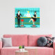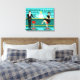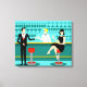 Chaque heure est l'heure heureuse avec ce Retro Cocktail Lounge Stretched Canvas Print. Le design moderne du milieu du siècle présente un dessin animé minimaliste et animé de style années 1960 d'un bar à cocktails élégant. Sur fond de mur d'aqua, on peut voir des rangées de verres de boisson. Au moins, on peut voir les silhouettes turquoises des lunettes de boisson. A en juger par les formes de la tige, ce bar est bien équipé pour mouiller votre sifflet, quelle que soit votre préférence de boisson. Un barman des plus compétents et personnalisables est le bar turquoise aux accents jaunes. Le jeune bardonte porte une chemise blanche immaculée avec cravate arc noir. Son apparence fraîche, ses cheveux blonds et ses lunettes noires de hipster nous donnent toutes les raisons de croire qu'il passe ses journées en tant qu'acteur en difficulté ou en tant que super-héros. D'un côté, le beau mixologiste donne un martini à un client de l'autre côté du bar. Le client en attente est un gentleman à larges épaules en costume noir et cravate rouge. C'est le genre de gars qui est décrit comme grand, sombre et beau même quand il reste des heures jusqu'à la fermeture. Il semble y avoir un tabouret rouge et chrome avec le nom de M. Debonair dessus. Mais pour ne pas être présomptueux, il pose la question : "Pardonnez-moi. Est-ce que ce siège est pris ?" Il demande à la fille aux cheveux raven sur le tabouret du bar voisin. C'est une vraie "fille d'à côté", si vous vivez à côté d'une beauté impeccable avec un personnage qui ne démissionnera pas. Elle porte une robe noire et tient un martini d'une main. Elle espère qu'elle et l'homme approchant ont plus en commun que leur préférence pour la boisson et le choix de la couleur de l'armoire. On dirait que ce soir est devenu intéressant. Bravo !