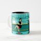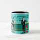 Every hour is happy hour with this Retro Cocktail Lounge Mug. The mid century modern design features a vibrant, 1960's style, minimalist, cartoon drawing of a classy, cocktail bar. Against the backdrop of an aqua wall, we can see rows of drink glasses. At least we can see the teal silhouettes of drink glasses. Judging from the shapes of the stemware, this bar is well equipped to wet your whistle, whatever your drink preference. A most competent and personable bartender is manning the teal bar with yellow accents. The young barkeep is wearing a pristine, white shirt with black bow tie. His fresh-faced good looks, blonde hair and black hipster glasses give us every reason to believe that he either spends his days as a struggling actor or a superhero. In one hand, the handsome mixologist is handing a martini to a customer on the opposite side of the bar. The waiting customer is a broad-shouldered gentleman in a black suit and red tie. He's the sort of fellow who is described as tall, dark, and handsome even when it's still hours until closing time. There seems to be a red and chrome bar stool with Mr. Debonair's name on it. Yet, not to be presumptuous, he asks the question, "Pardon me. Is this seat taken?" He is asking the raven haired gal on the neighbouring bar stool. She's a real "girl next door" type, if you happen to live next door to a flawless beauty with a figure that won't quit. She is wearing a black dress and holding a martini in one hand. She's hoping that she and the approaching gentleman have more in common that their drink preference and choice of wardrobe colour. It looks like this evening just got interesting. Cheers to you!