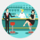 Every hour is happy hour with these Retro Cocktail Lounge Stickers. The mid century modern design features a vibrant, 1960's style, minimalist, cartoon drawing of a classy, cocktail bar. Against the backdrop of an aqua wall, we can see rows of drink glasses. At least we can see the teal silhouettes of drink glasses. Judging from the shapes of the stemware, this bar is well equipped to wet your whistle, whatever your drink preference. A most competent and personable bartender is manning the teal bar with yellow accents. The young barkeep is wearing a pristine, white shirt with black bow tie. His fresh-faced good looks, blonde hair and black hipster glasses give us every reason to believe that he either spends his days as a struggling actor or a superhero. In one hand, the handsome mixologist is handing a martini to a customer on the opposite side of the bar. The waiting customer is a broad-shouldered gentleman in a black suit and red tie. He's the sort of fellow who is described as tall, dark, and handsome even when it's still hours until closing time. There seems to be a red and chrome bar stool with Mr. Debonair's name on it. Yet, not to be presumptuous, he asks the question, "Pardon me. Is this seat taken?" He is asking the raven haired gal on the neighbouring bar stool. She's a real "girl next door" type, if you happen to live next door to a flawless beauty with a figure that won't quit. She is wearing a black dress and holding a martini in one hand. She's hoping that she and the approaching gentleman have more in common that their drink preference and choice of wardrobe colour. It looks like this evening just got interesting. Cheers to you!