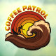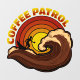 Coffee Patrol. Surfer with a cup of coffee riding a coffee wave with a sunset in the background. Retro 70s distressed style.