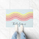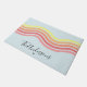 Greet friends and family to your house with this vibrant and eye-catching personalized Retro Colourful Blue Groovy Lines Beach Sunrise Doormat, featuring abstract wavy lines in a colour palette inspired by a beautiful sunrise. Perfect for a beach house, vacation rental, seaside cottage or a wonderful housewarming gift.