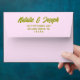 A retro modern bright vivid blue and pink wedding envelope. Which features bold whimsical green bride and groom's names in bright blush pink background colour. And personalized return address . Which suits the whole wedding suite.