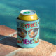 Retro Colourful Summer Vibes Can Cooler featuring sunglasses, beach, palm trees, sun, pineapples, and watermelons.