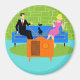 This Retro Couple with Cat Magnet features a cartoon couple trying to get cozy while watching television on a mid century modern, blue sofa. The cat, however, has other ideas. On one side of the sofa, there is a handsome man in a black suit with red tie. On the other side of the stylish couch, there is a beautiful, blonde woman in a form fitting, hot pink dress. Things would be going great if it weren't for the sleek black cat, which has laid claim to the centre sofa cushion. This 1960's style, minimalist art design is set in a stylish living room. The sofa's backdrop is a green, stone wall. On the aqua floor, there is a round, green shag rug, which matches the stone wall. At the forefront of the design, we see the back of an orange television set with rabbit ears, which seems to be playing the cat's favourite TV program.